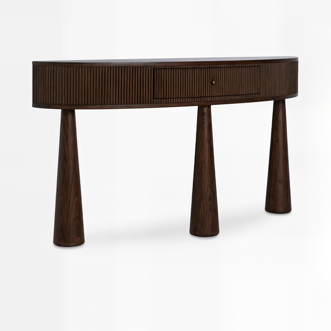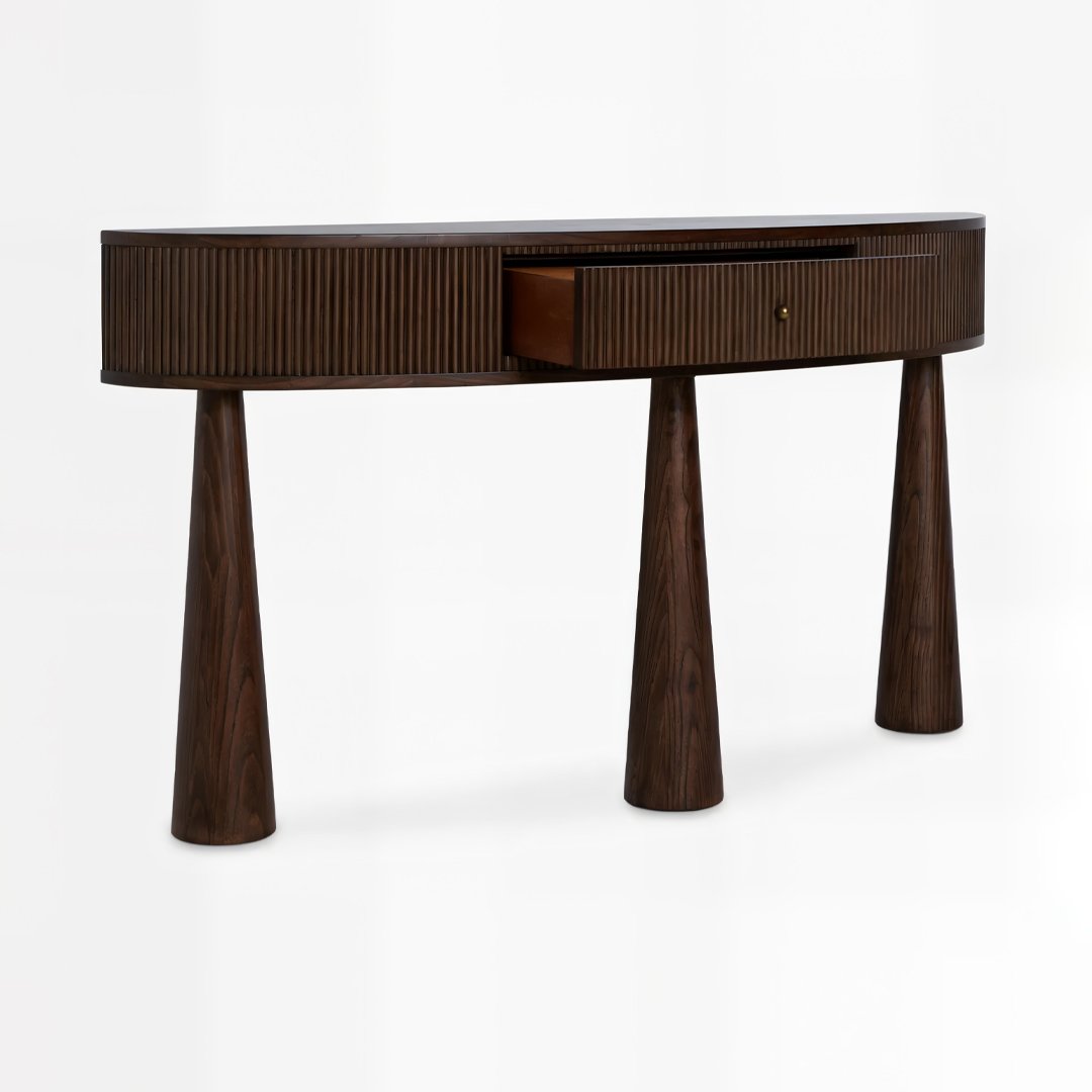 Unique semi-circular top and two large, tapered, round legs. Single central drawer with a fluted/ribbed front texture and a small brass-toned pull knob.