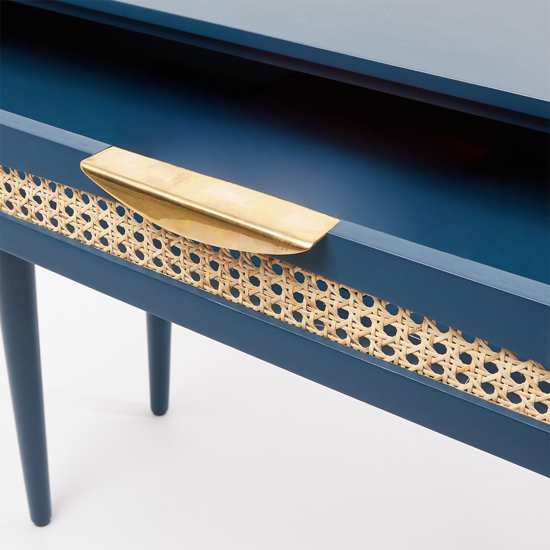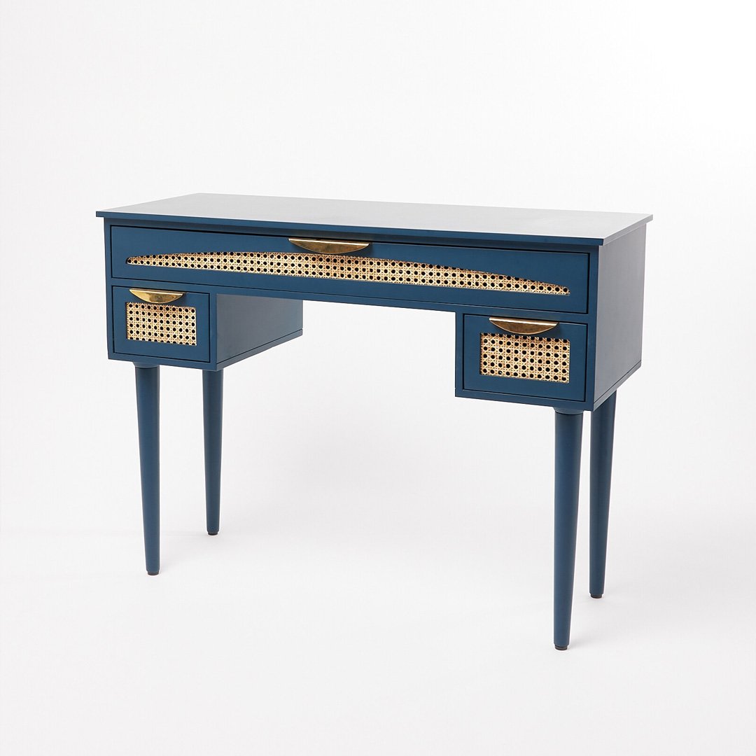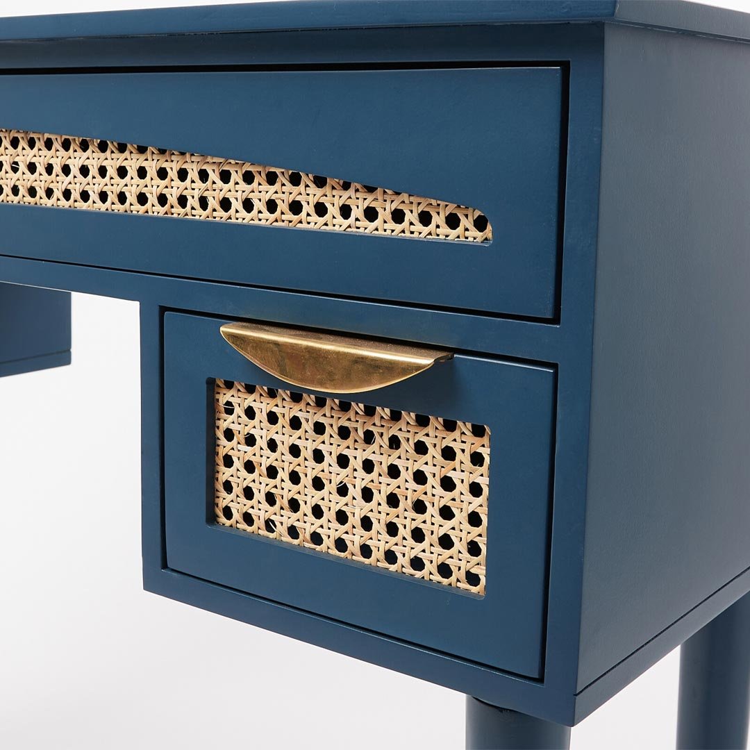 Blue Harmony Sheesham Wood Study Table with Rattan Drawers – Modern Blue Writing Desk- Wooden Slice