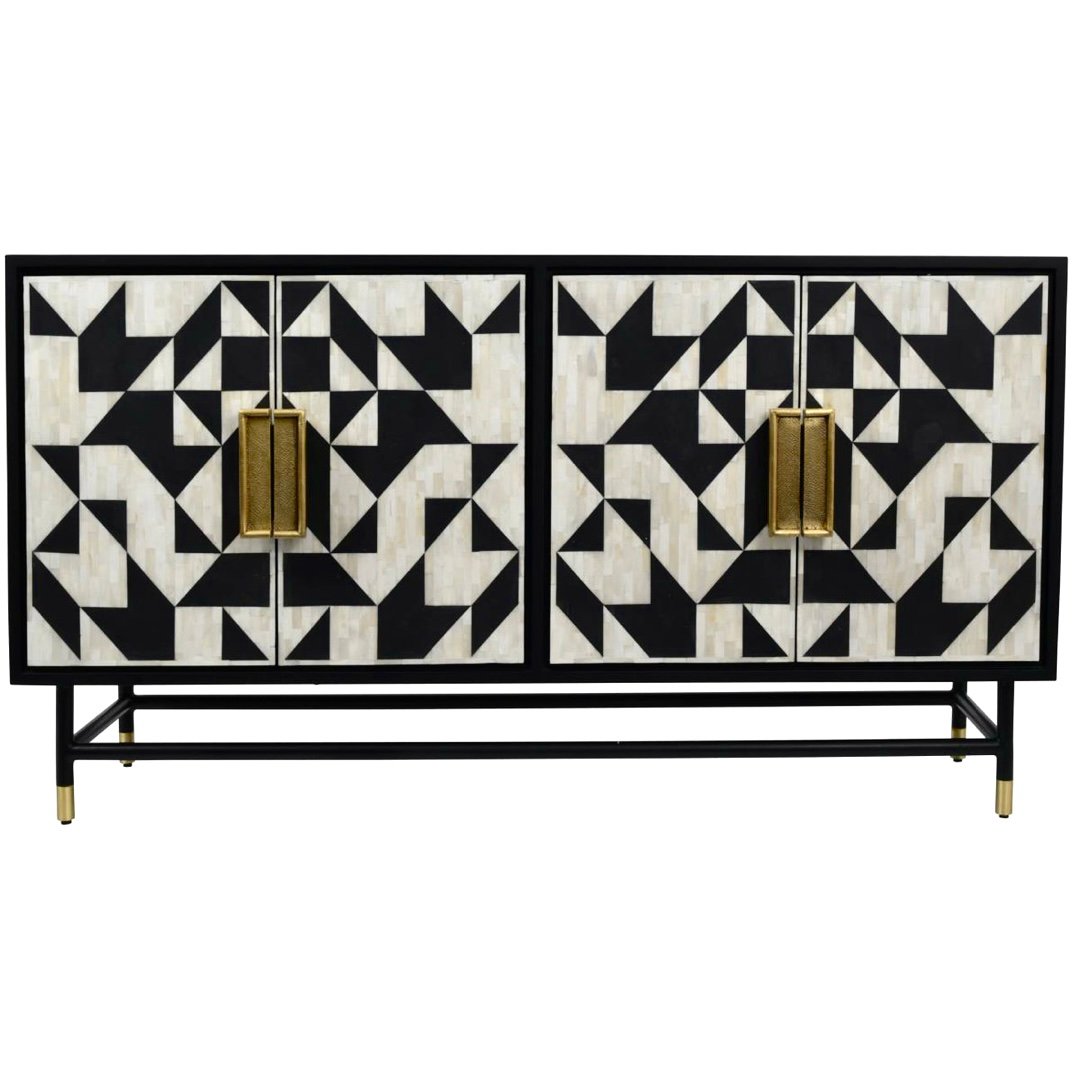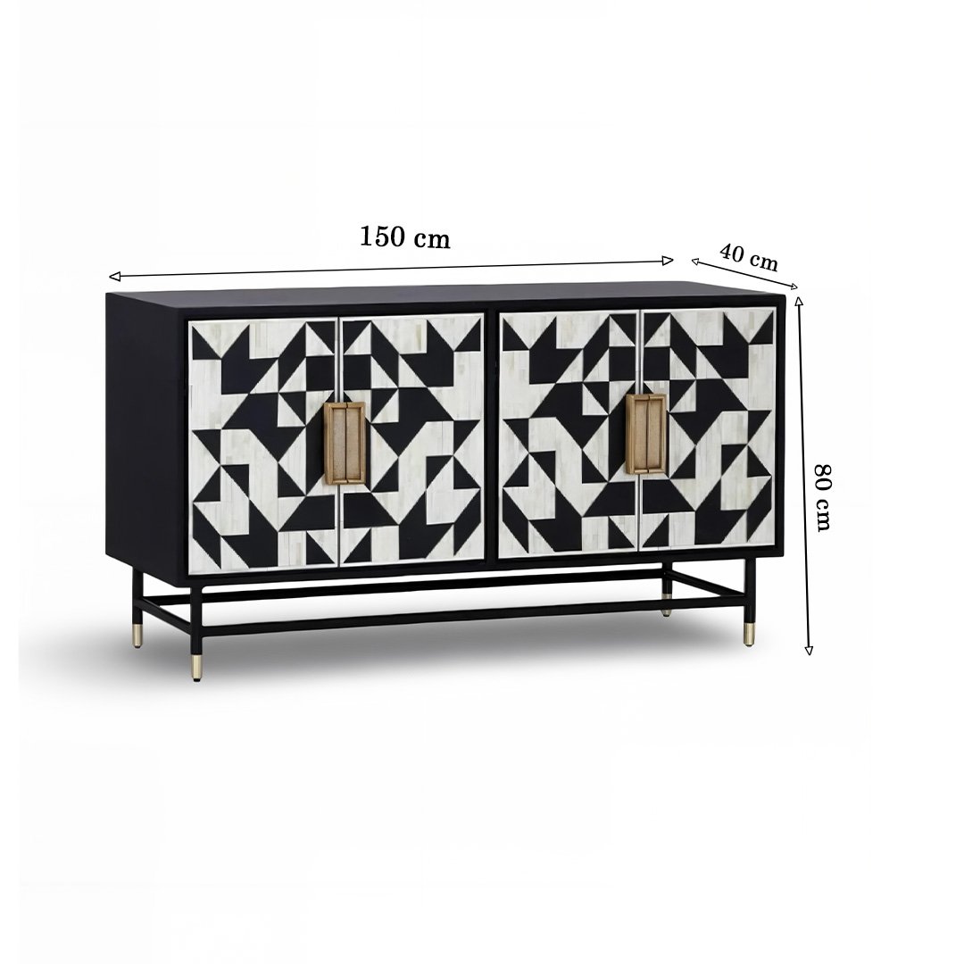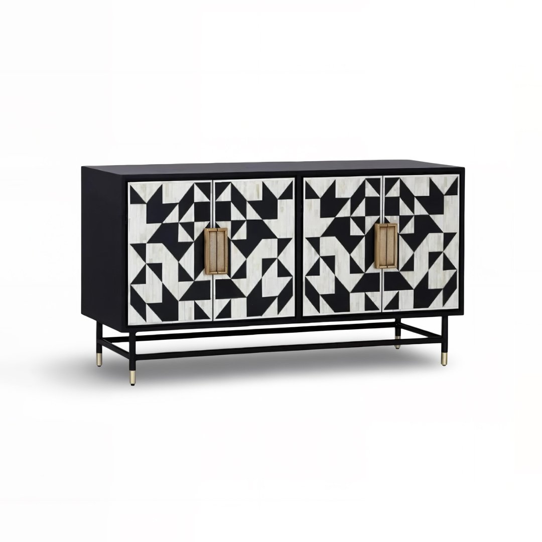 Bring refined artistry into your home with The Bonecraft Bone Inlay Buffet Cabinet, an exquisite fusion of handcrafted tradition and contemporary design. Crafted using solid mango wood, bone, and resin, this elegant buffet storage cabinet stands out with its bold black-and-white honeycomb pattern — meticulously inlaid by skilled artisans.