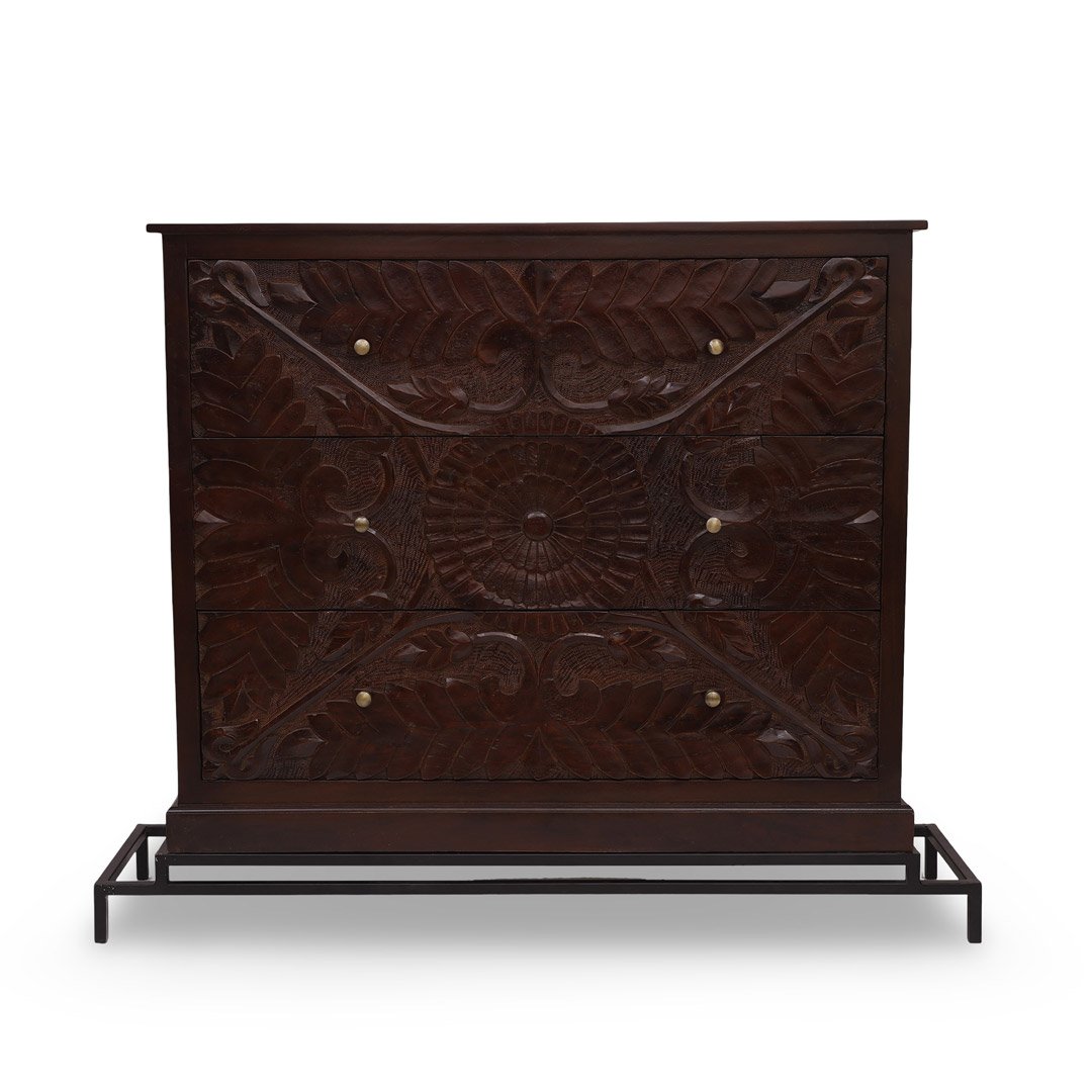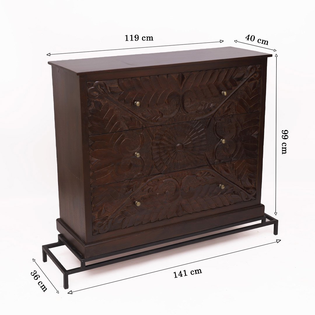 Handcrafted Sheesham wood dresser with intricate floral carving and black metal base