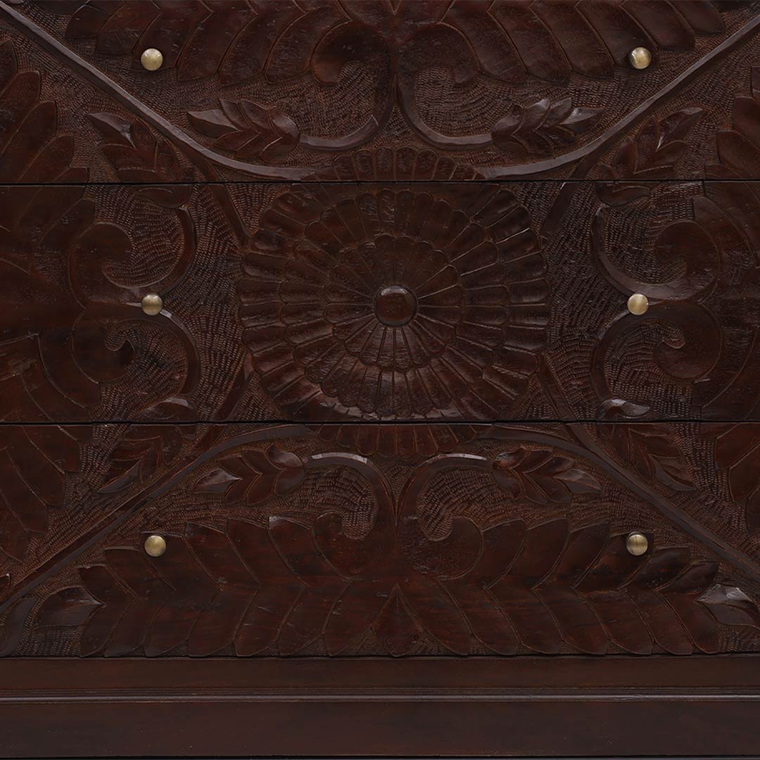 3 spacious pull-out drawers with brass knobs, each adorned with intricate, large-scale hand-carved floral or ornate pattern