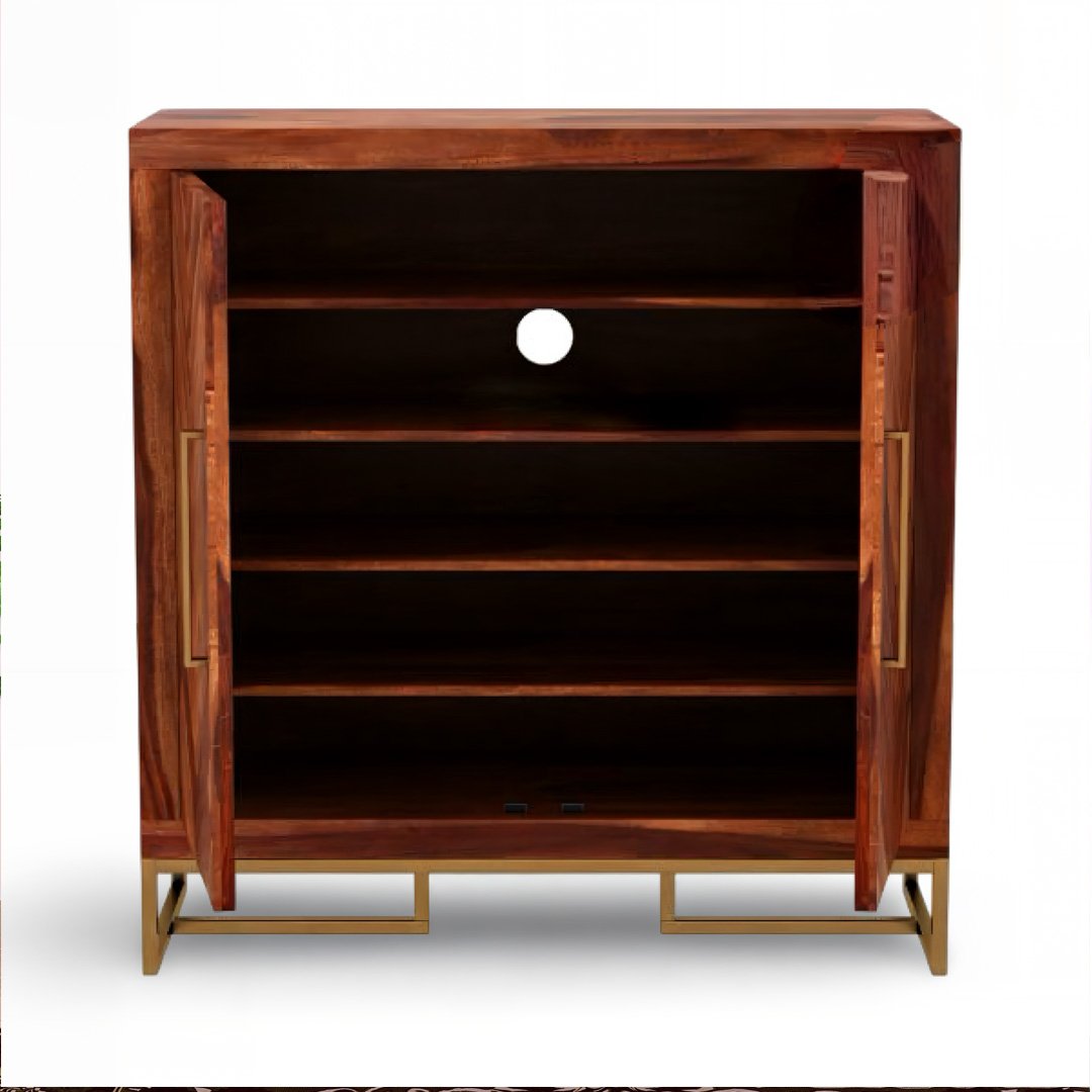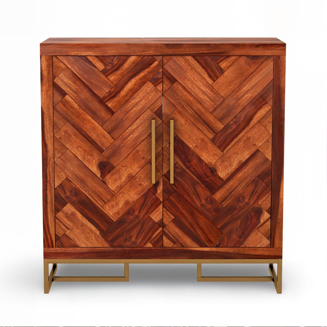 Elevate your home’s organization and elegance with Cabaska, a stunning handcrafted Sheesham wooden shoe rackfrom Wooden Slice. This luxury storage unit combines modern minimalism with traditional craftsmanship, offering a striking herringbone pattern on solid Sheesham wood, paired with sleek metallic legs and handles.