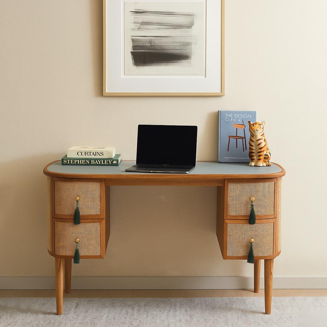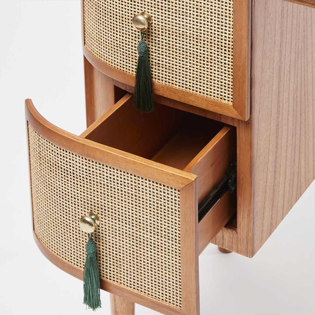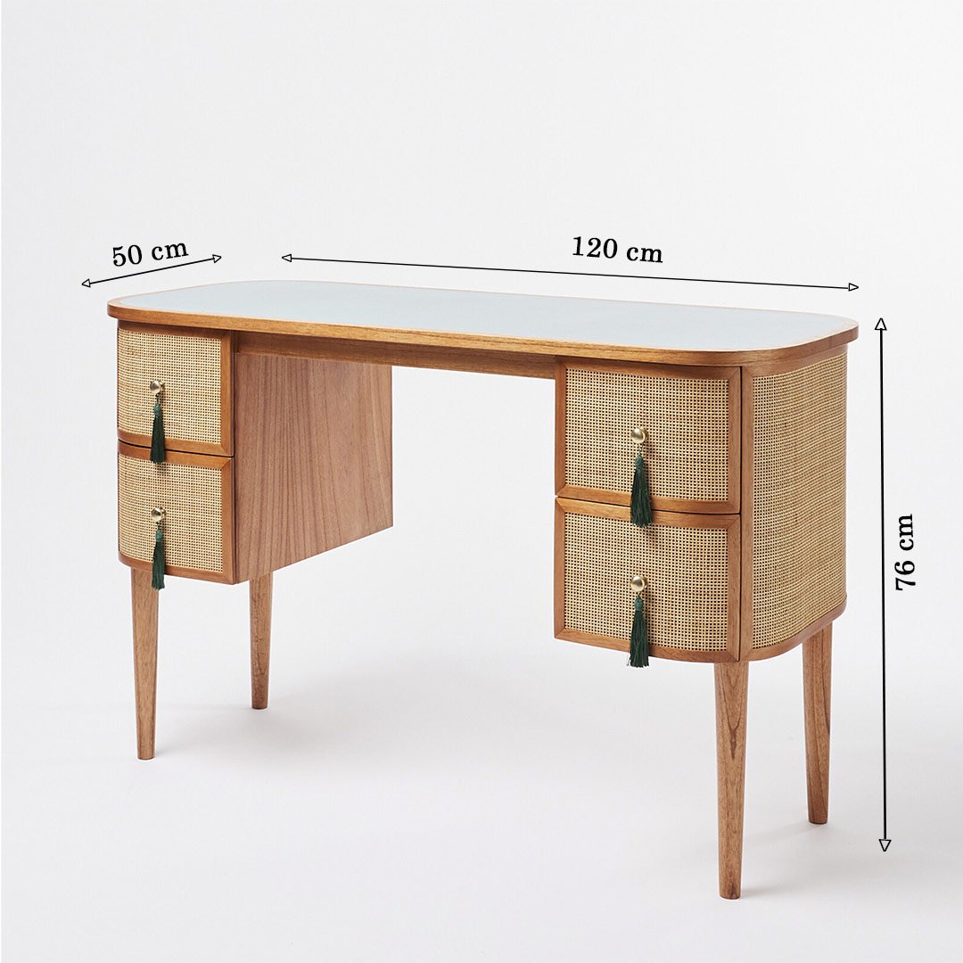 Each drawer is fronted with handwoven natural cane rattan, offering breathability and texture, complemented by forest green tassel knobs for a touch of quiet luxury. The smooth tabletop is ideal for writing, laptop work, or creative pursuits, while the four drawers provide ample space to organize your stationery, journals, tech, and more.