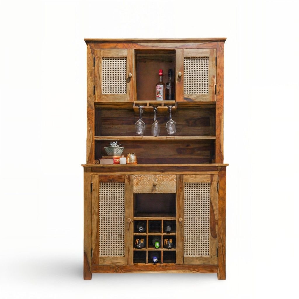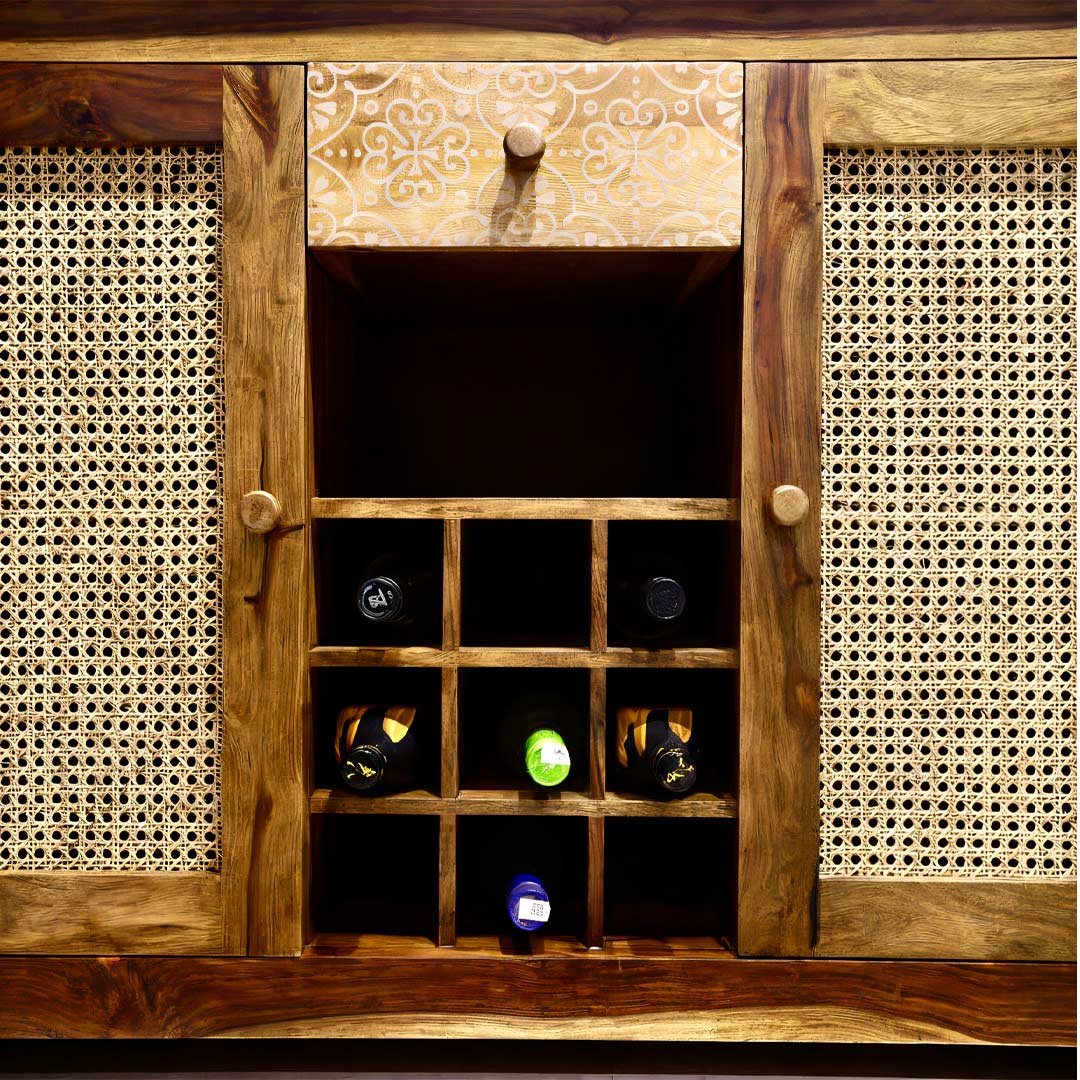 Elevate your hosting game with the Driftbar, a stunning handcrafted Sheesham wooden bar cabinet by Wooden Slice that blends rustic charm with modern utility. Adorned with intricately woven rattan panel doors, artistic brass-finished hardware, and a thoughtfully designed layout, Driftbar is more than a bar cabinet—it’s a centerpiece for your living or dining space.