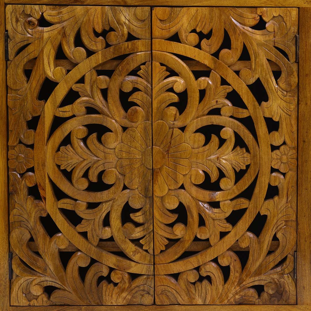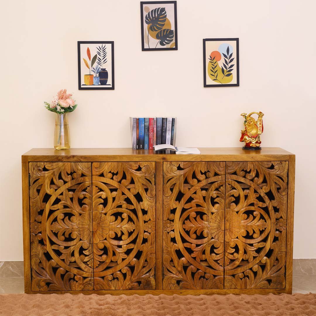 Infuse your living space with the timeless charm of the Lightroot Sideboard by Wooden Slice — a masterful expression of traditional craftsmanship and natural beauty. Hand-carved from solid Sheesham wood, this stunning piece showcases intricate floral medallion patterns that reflect the spirit of heritage artistry.
