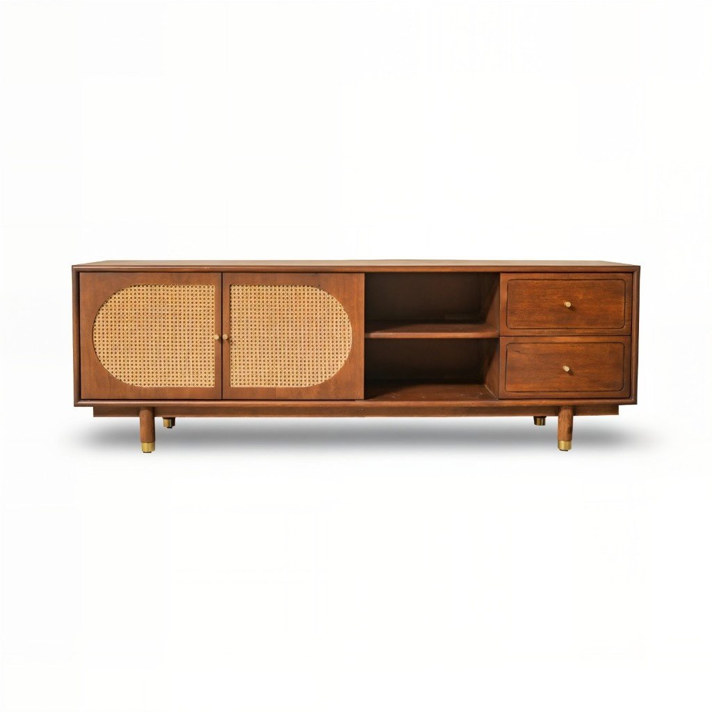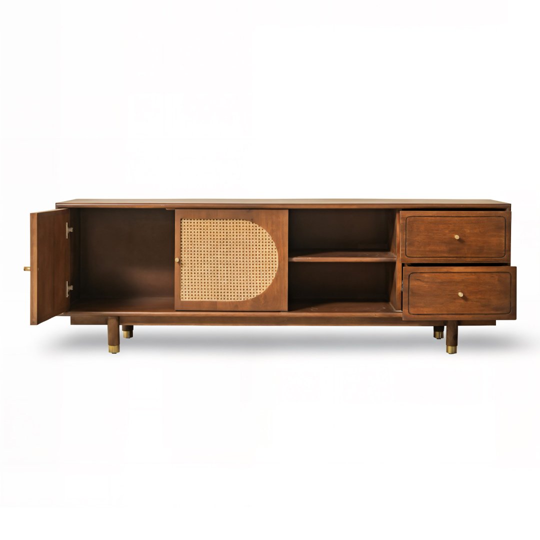 Luxora Mango Wood Rattan TV Unit – Mid-Century Modern Media Console with Storage- Wooden Slice