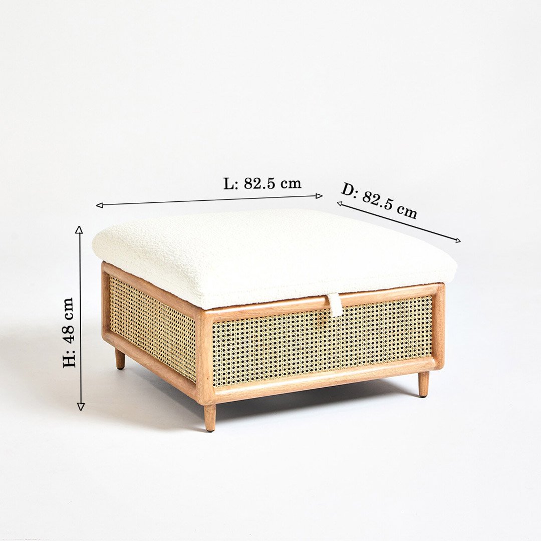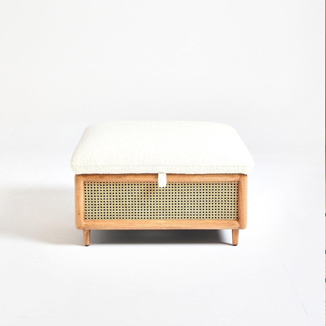 Mora, a refined fusion of timeless craftsmanship and modern utility. Designed by Wooden Slice, this handcrafted Mango wood ottoman is adorned with intricately handwoven natural cane on all sides, creating an elegant texture and aesthetic warmth.