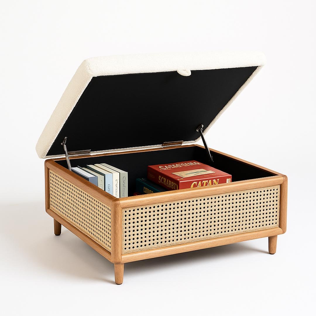 Mora Mango Wood Rattan Storage Ottoman with Lid – Square Lift-Top Accent Bench