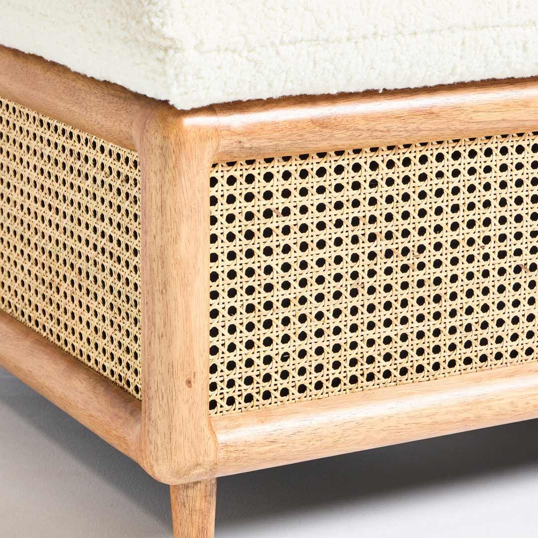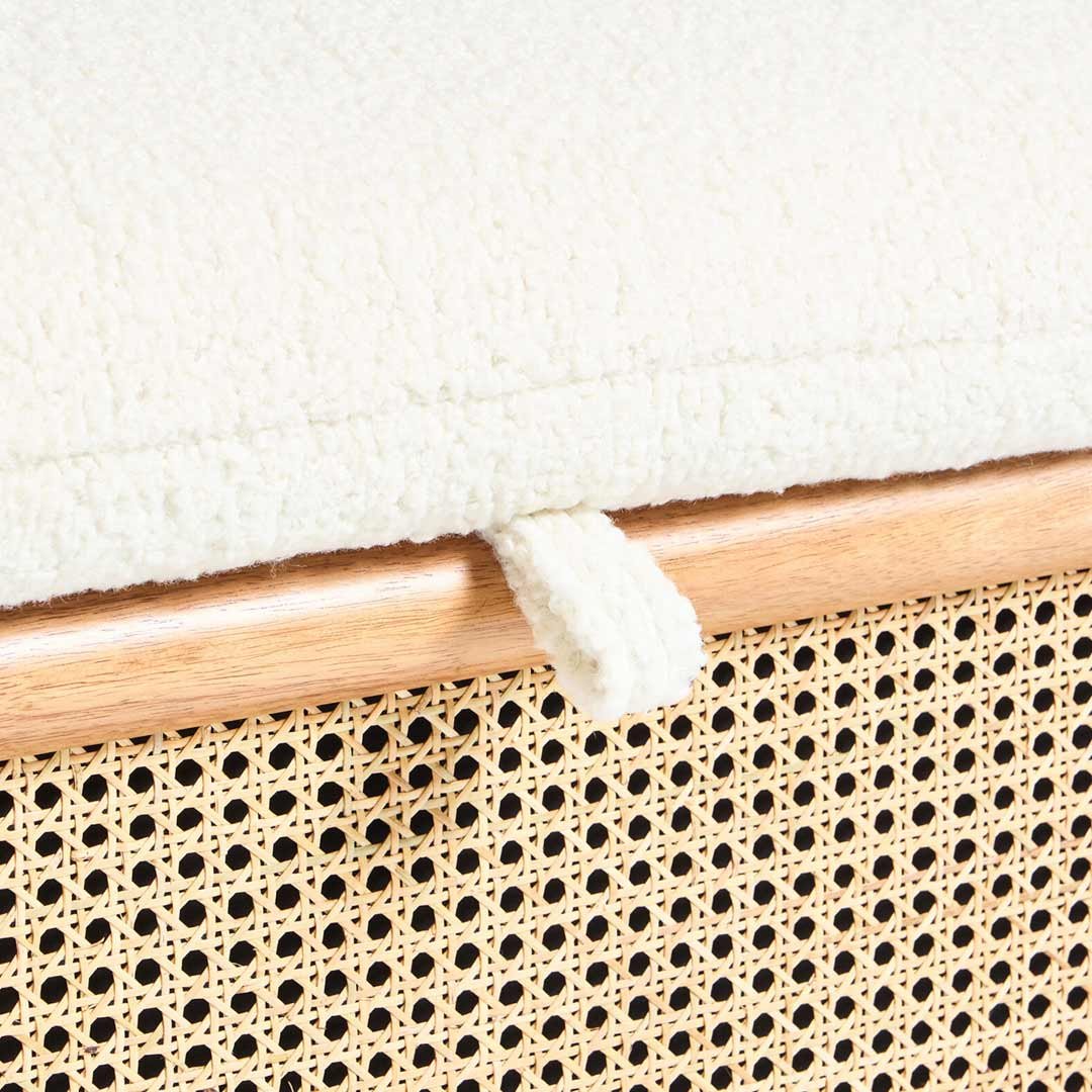 Square shape, cane webbing (rattan) sides, tapered legs, lift-top lid with sherpa fabric upholstery, internal storage compartment