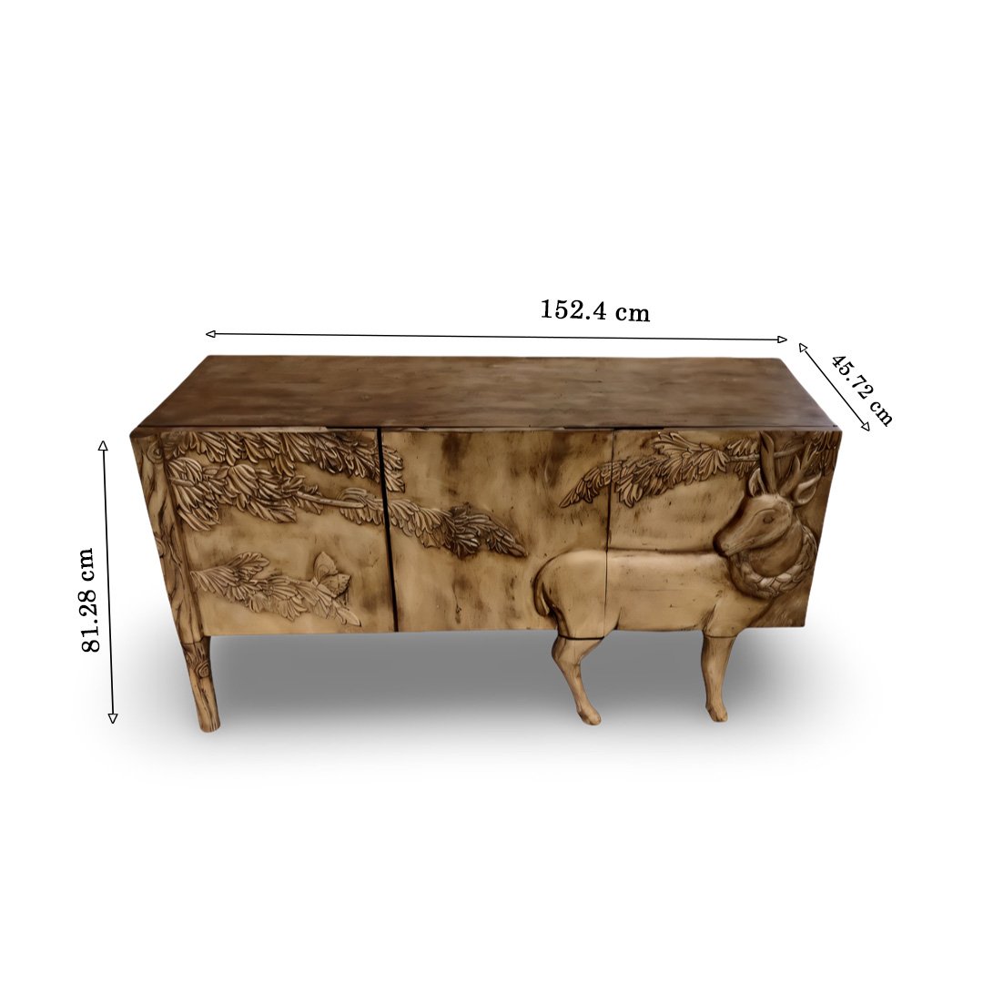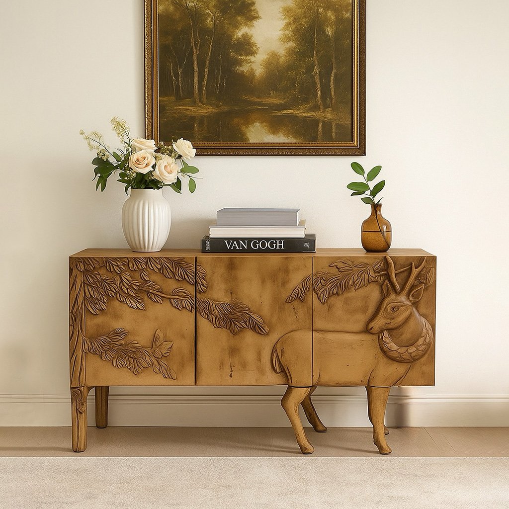 Bring the wilderness indoors with our Raindeer Hand-Carved Wooden Deer Sideboard, a true tribute to natural storytelling and traditional craftsmanship. Exclusively from Wooden Slice, this unique piece features a majestic deer carved in lifelike detail, framed by foliage motifs across the front facade. The sideboard is not just storage—it’s functional art.