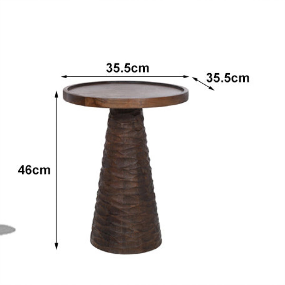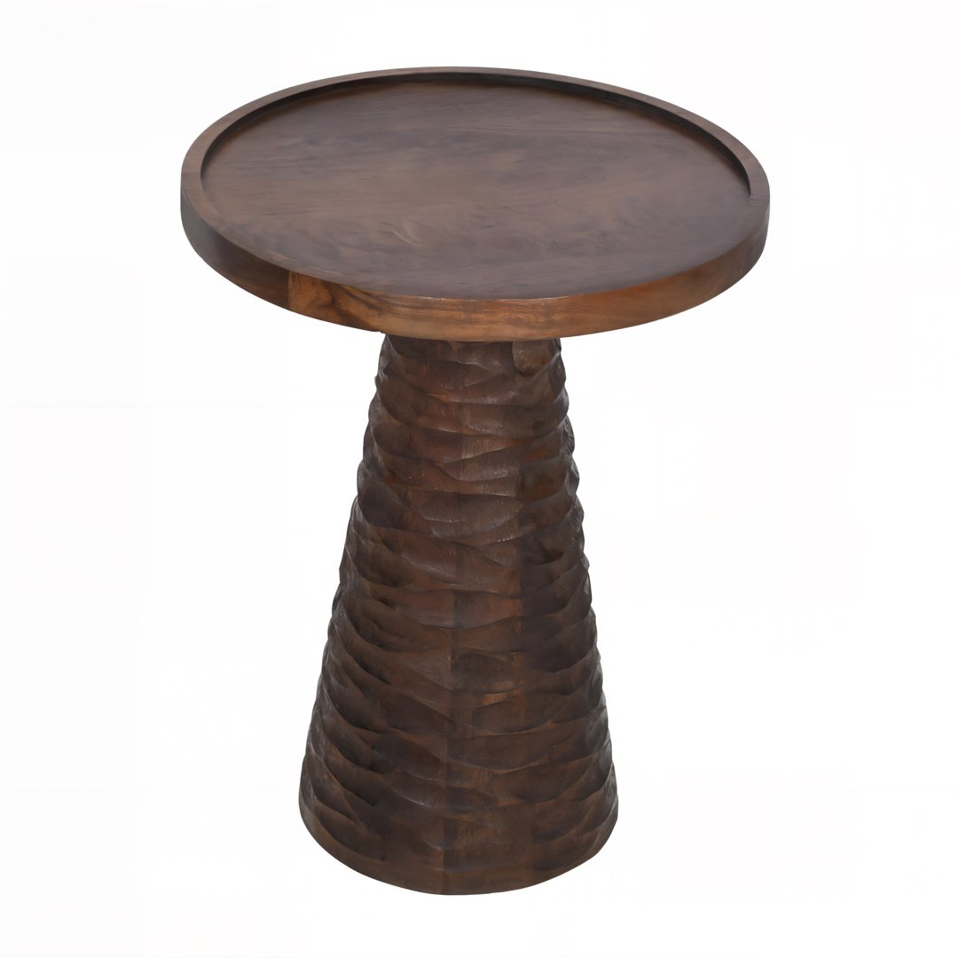 Ravilo, a handcrafted Sheesham wood end table from Wooden Slice. This stunning piece blends rustic texture with refined form, featuring a meticulously hand-carved conical base and a clean, round tabletop with a subtle rim—perfect to keep your drinks, books, or décor in place.