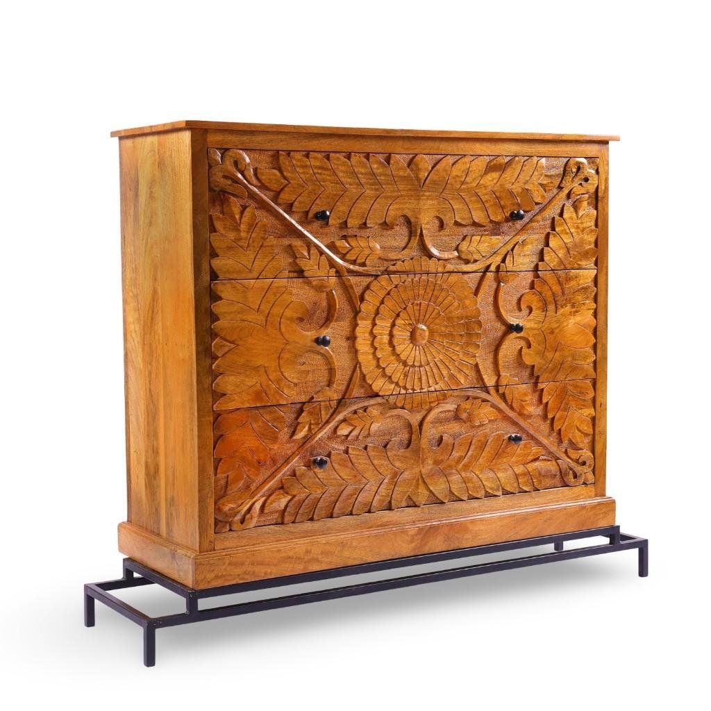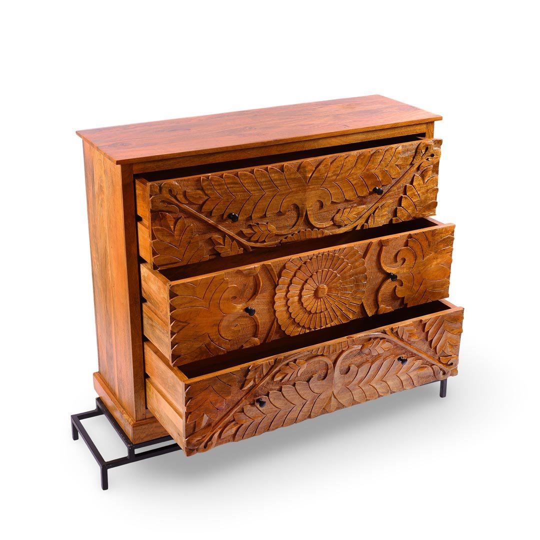 Discover the Rawin Chest of Drawers, a magnificent piece crafted from solid Sheesham wood. Each of its three spacious drawers features intricate hand-carved floral and leaf patterns, creating a stunning visual appeal. Supported by a sleek metal base, this console table combines artistic design with practical storage, making it a perfect addition to any space seeking a touch of unique craftsmanship.