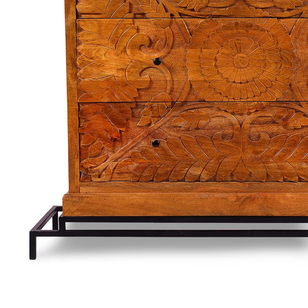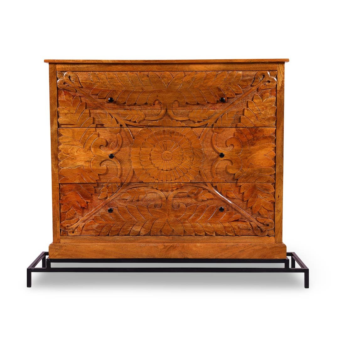 Exquisite hand-carved floral and leaf patterns on three spacious drawers, complemented by a modern black metal frame base