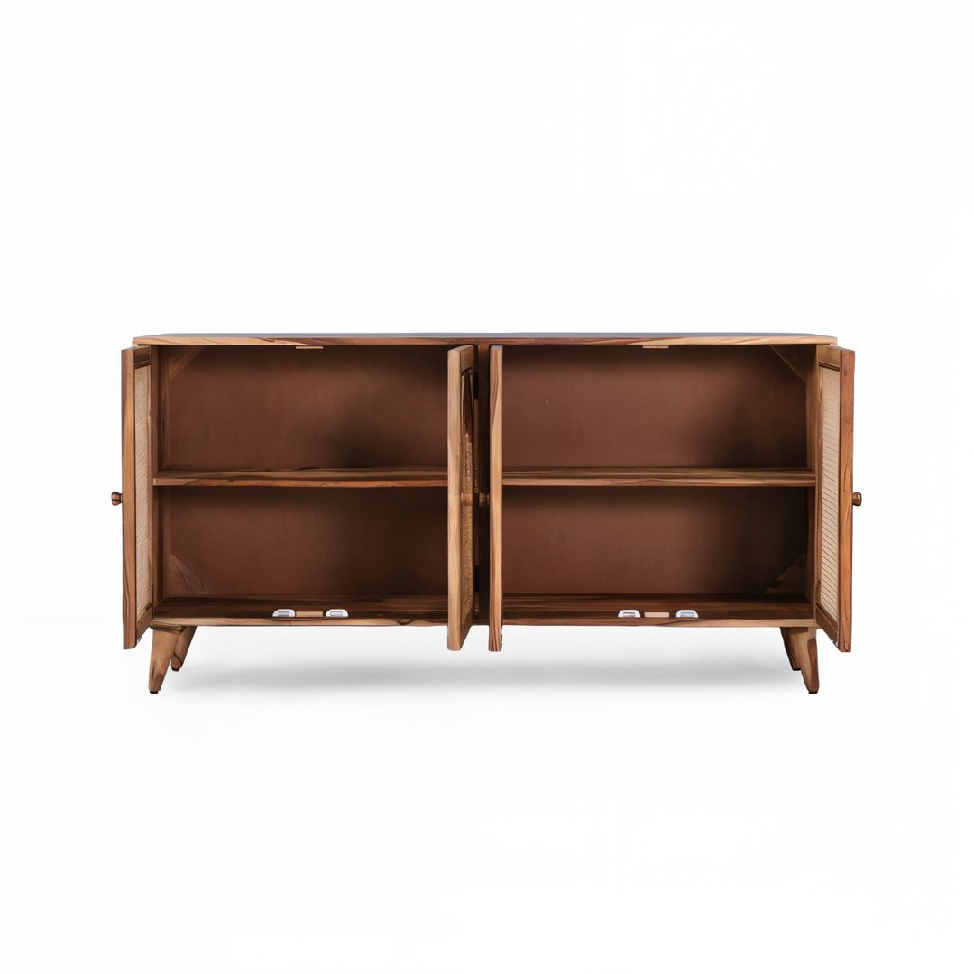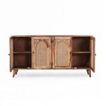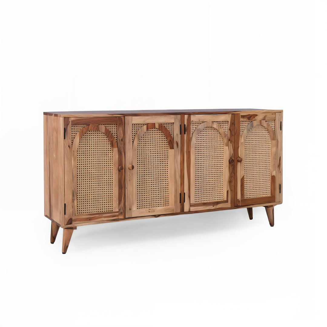 The gracefully arched cane panels on each door highlight its artisanal craftsmanship while providing breathable storage. Whether placed in your dining room, hallway, or living space, Stowlyn offers versatile functionality and artistic appeal in one refined piece.