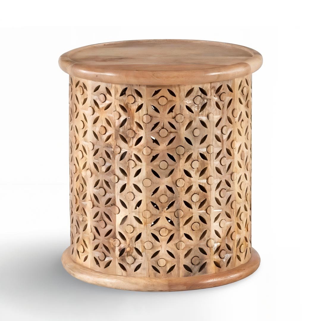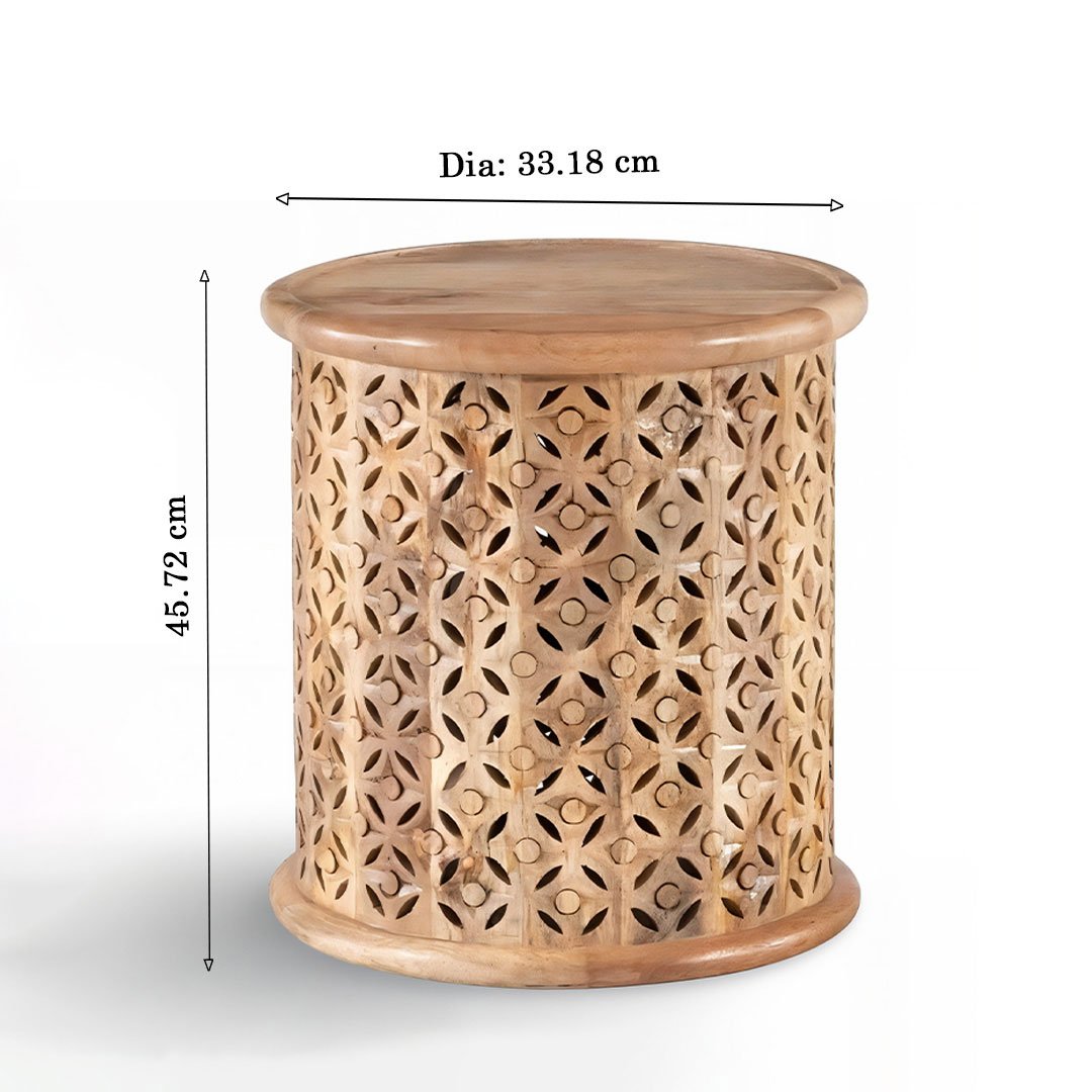 Stubo Hand-Carved Natural Sheesham Wood Drum Side Table – Jali Accent Console- Wooden Slice