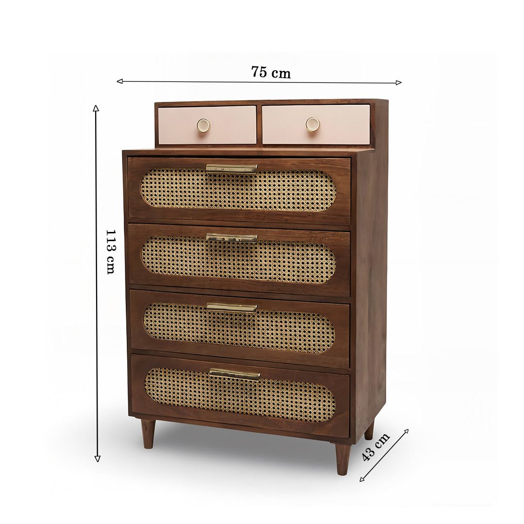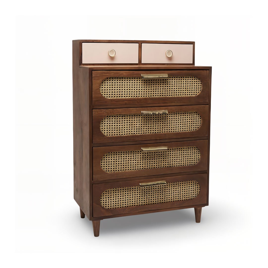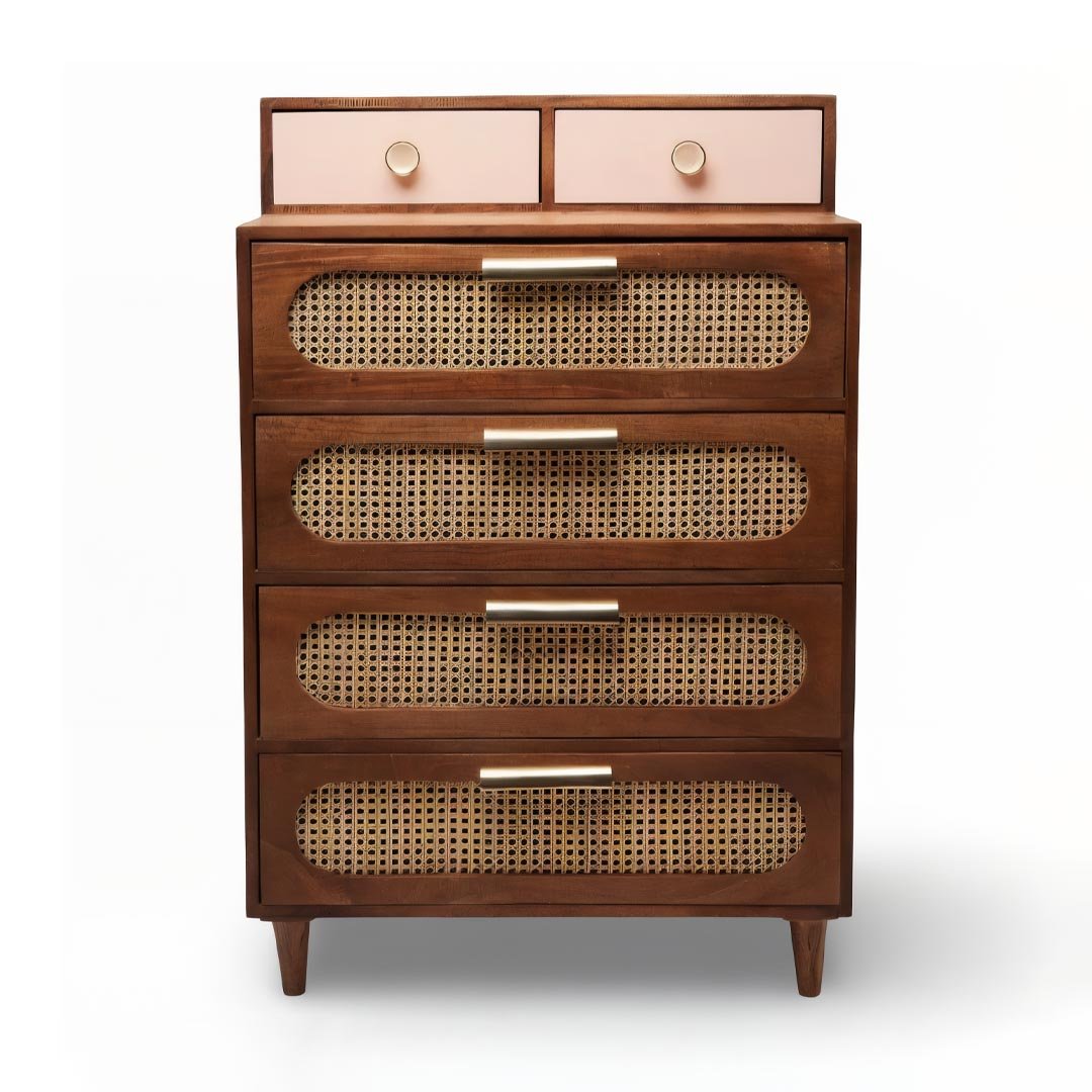 Designed for both style and storage, this tall wooden chest features a unique configuration of six drawers. The bottom four drawers showcase soft curves and earthy cane textures, while the top two stand out in a delicate pastel pink, offering a soft pop of color. Elegant gold-toned and ceramic crackle-glazed knobs provide the final artisan touch.