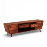 Introduce elegance, utility, and bold aesthetics to your living room with Viewlen, a handcrafted Sheesham wooden TV unit that exemplifies modern craftsmanship and timeless functionality. Featuring a unique trapezoidal silhouette, Viewlen stands out with its minimalist metal handles, rich wood grain patterns, and naturally warm finish that enhances any interior décor.
