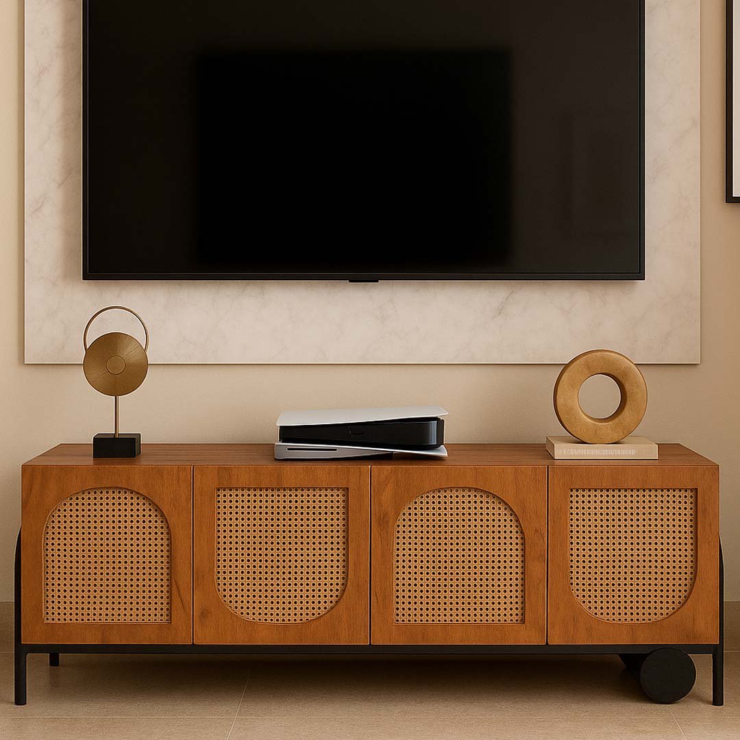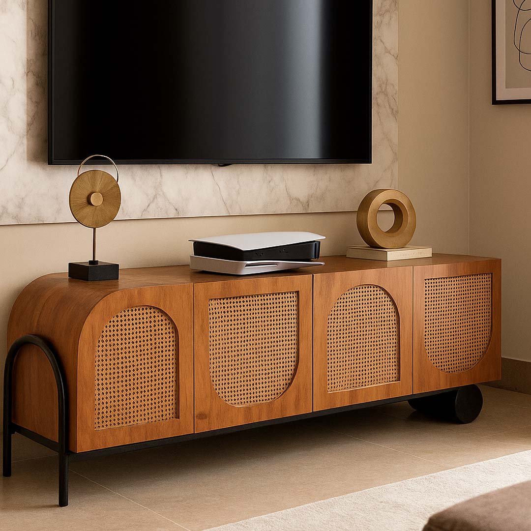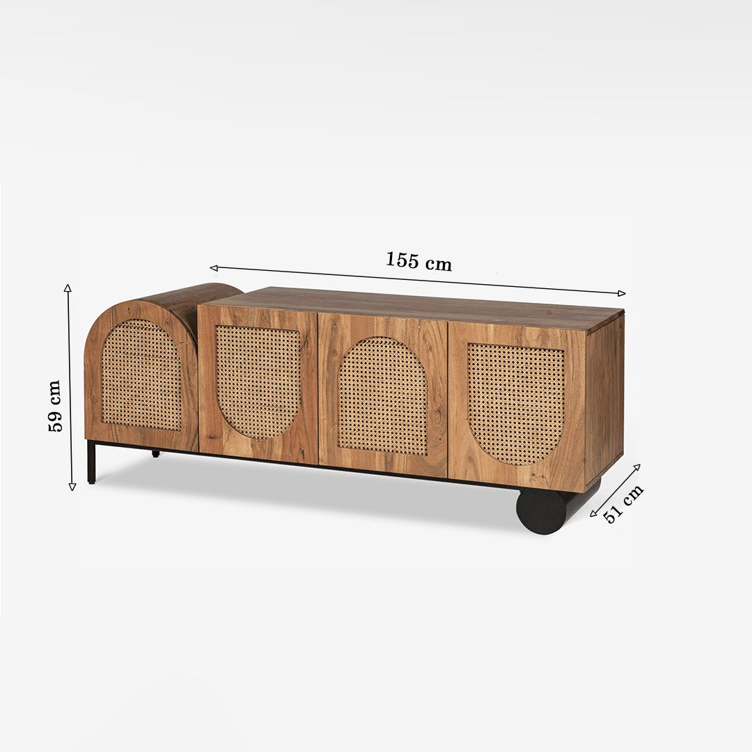 Vistaar Mango Wood Rattan TV Unit | Modern Asymmetrical Media Console- wooden slice