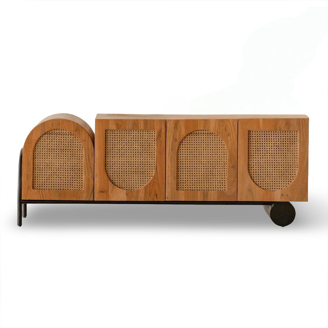 Unique, modern contemporary design featuring four cabinet doors, two semi-circular shape,and two regular rectangular doors with rattan.