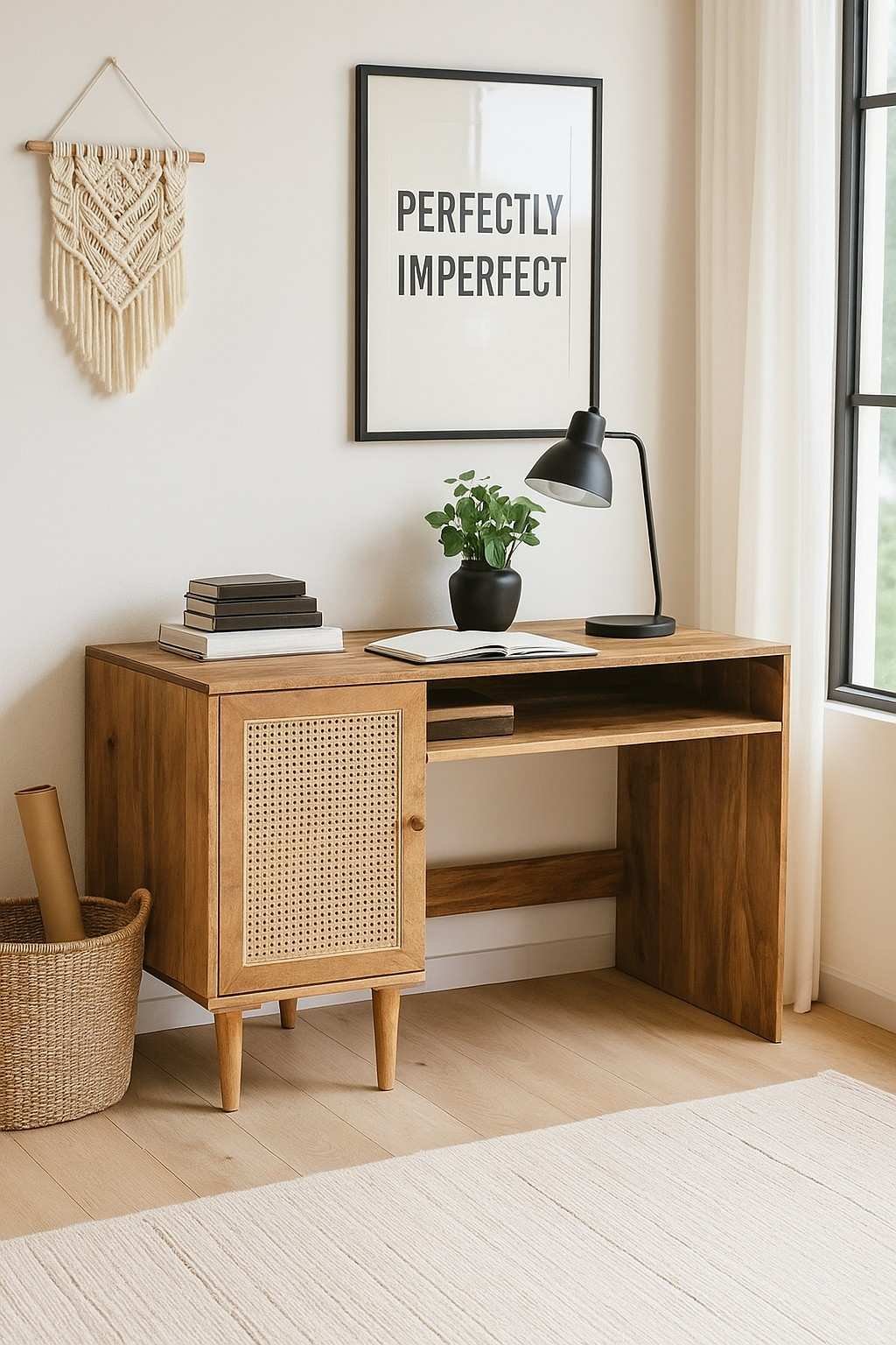 Designed to offer both sophistication and storage, Woodwise is equipped with a closed-door cabinet for books, files, or accessories and an open shelf to keep essentials within reach. Its natural wood grain, smooth finish, and handcrafted detailing make it a stunning addition to both modern and vintage-inspired interiors.